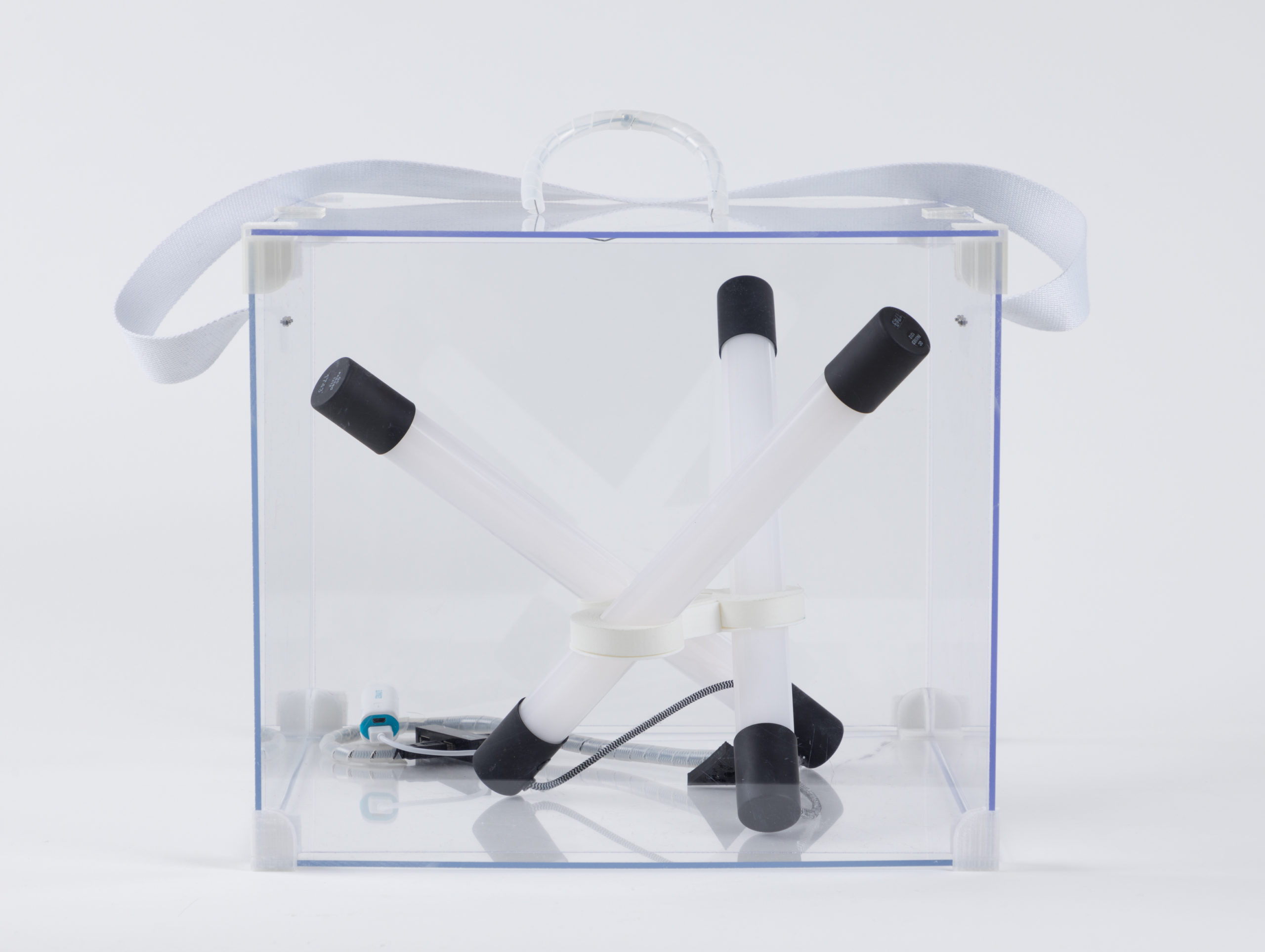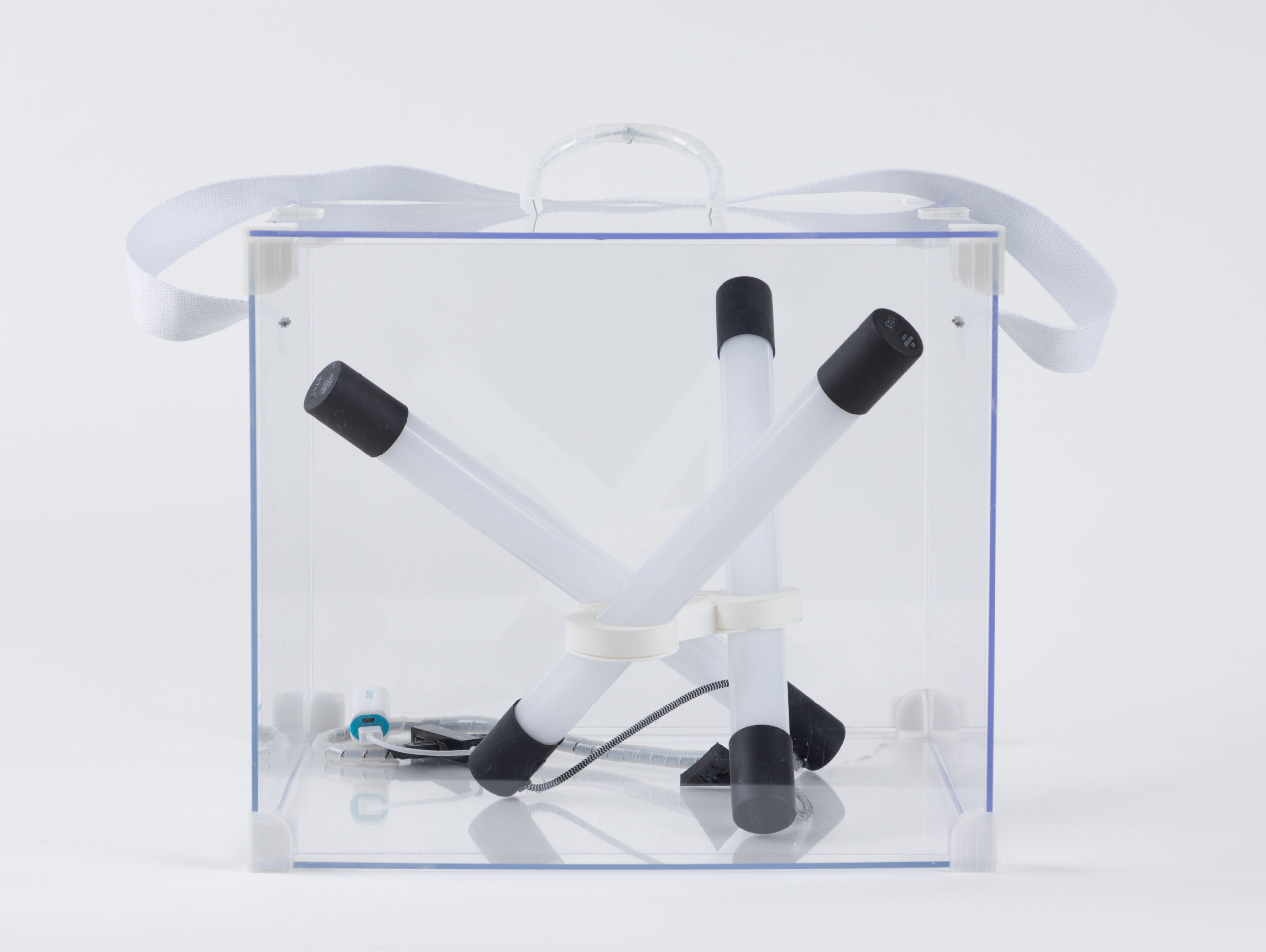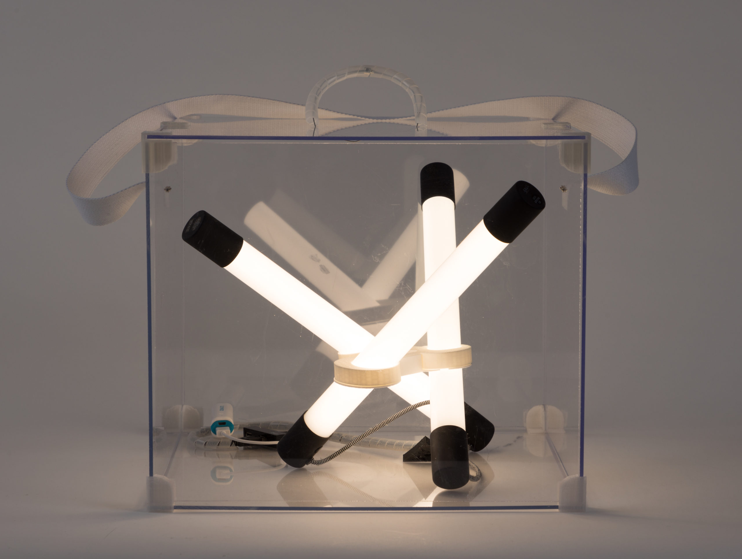 The box lamp is composed of three LED light that are encased in a recycled plexiglass box with dimensions 40 cm x 40 cm (base) x 33 cm (height). The LED tubes are USB powered and are connected to a portable charger (see the enclosed pictures and gif).